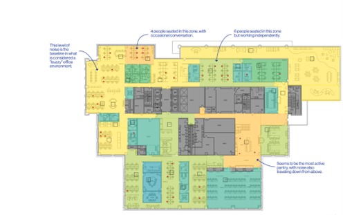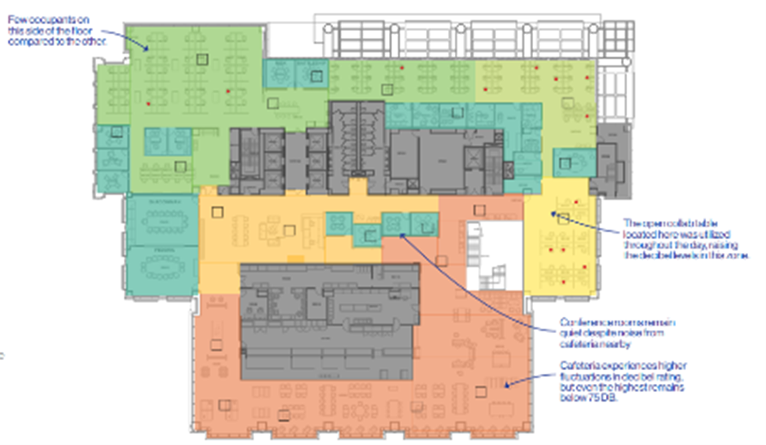So with the purchase of a few entry level decibel meters, we added sound recording to our site observation scope and walked the space recording volume levels across 10 floors, multiple times a day, to see how things varied. What did we find?